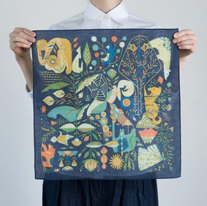 福田利之さん独自の技法で完成されたマチエールのある絵。この作品の持つ独特の質感と味わいをテキスタイルで再現したシリーズです。 1枚絵のイラストをハンカチに仕立てました。まるで原画を持ち歩いているかのような、そんなワクワク感を毎日の生活の中にお届けします。