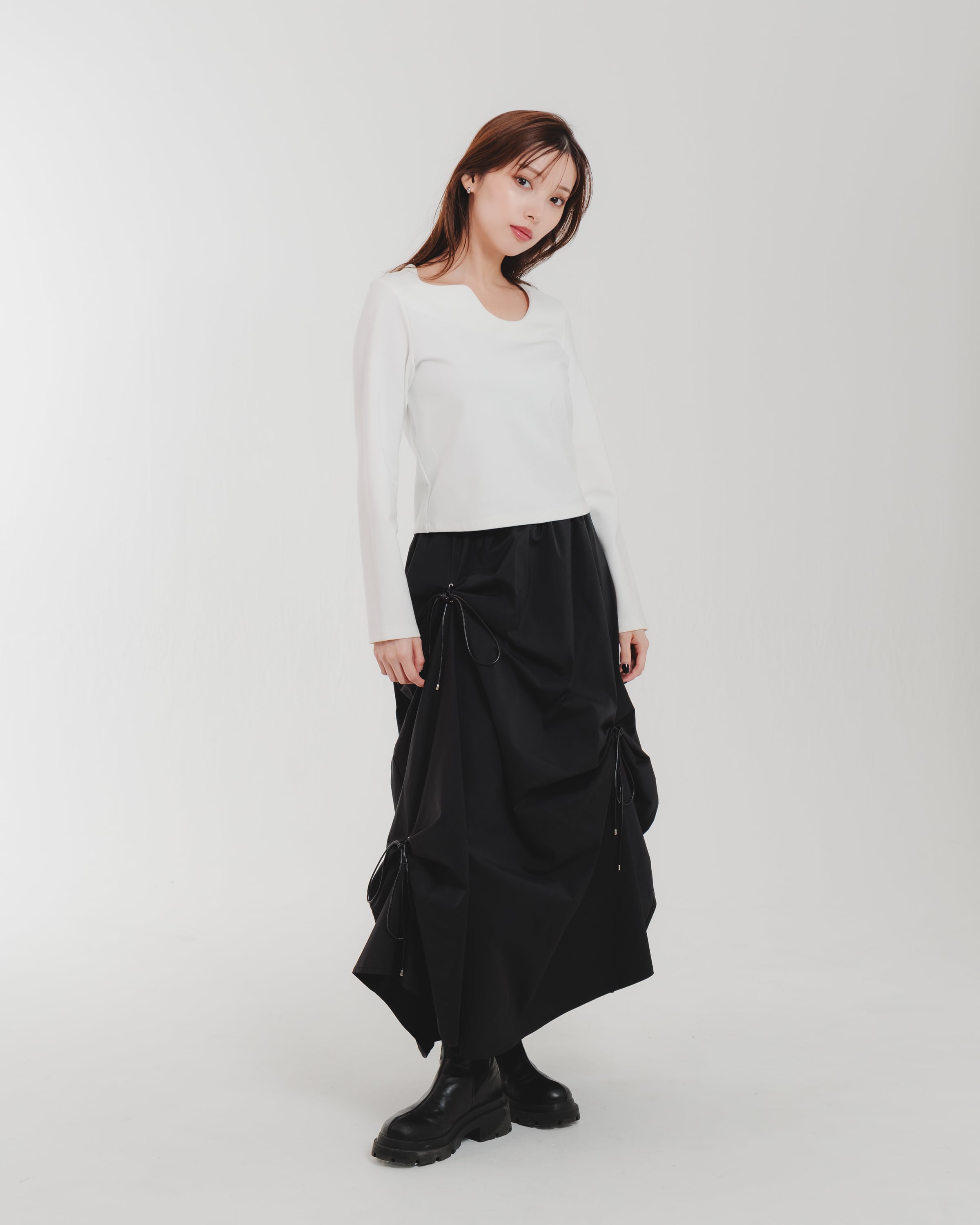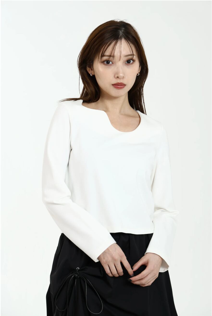 アシンメトリーのカーブデザインの衿元がさりげないポイントです。